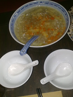 Nama menu d sini aneh2 (yah kocak juga lah.. hehehe).. Terus dia lebih ke konsep yg makan meja gt.. jadi makanan taro di tengah, dan pesen dah lauk pauk nya.. dan stlh bbrp kali bolak balik menu, gw akhirnya memutuskan membeli Nasi Goreng Radja Ketjil (biasa banget dah... ) & dikarenakan agak2 dingin, gw memutuskan minum Teh Tawas Panas.. hehehehe kalo Eldi mesen makan nya Sup Radja Radja (alias Sup Kepiting Asparagus) & minum nya Teh Tawar Panas ama Bajigur... Gelo juga neh si Eldi, makan cuma sop doank.. parah dagh... @-@